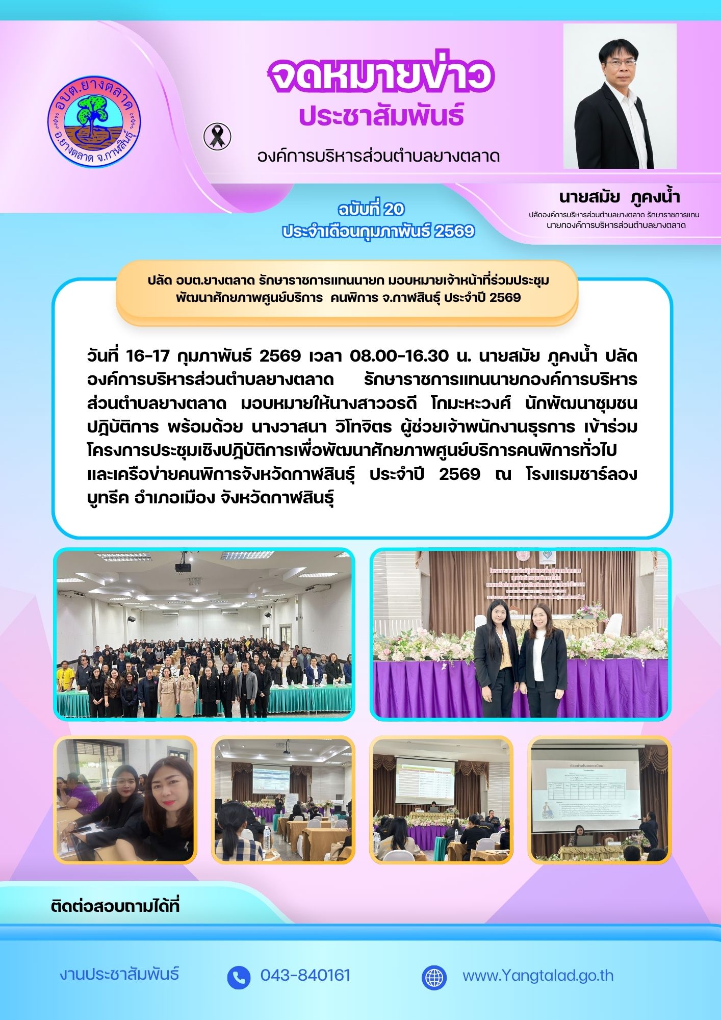 วันที่ 16-17 กุมภาพันธ์ 2569 ปลัด อบต.ยางตลาด รักษาราชการแทนนายก มอบหมายเจ้าหน้าที่ร่วมประชุมพัฒนาศักยภาพศูนย์บริการ คนพิการ จ.กาฬสินธุ์ ประจำปี 2569