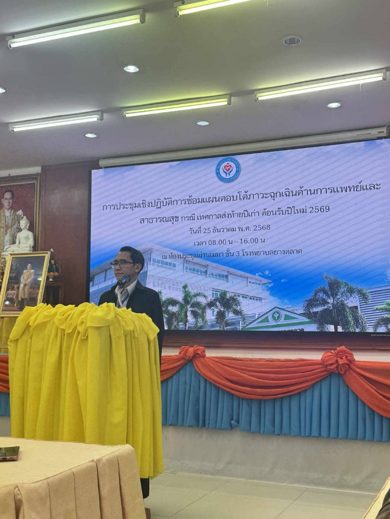 วันที่ 25 ธันวาคม 2568 เวลา 08.30 น. นายสมัย ภูคงน้ำ ปลัดองค์การบริหารส่วนตำบลยางตลาด ปฏิบัติหน้าที่ นายกองค์การบริหารส่วนตำบลยางตลาด มอบหมายให้งานสาธารณสุขฯและงานป้องกันฯเข้าร่วมประชุมเชิ่งปฏิบัติการซ้อมแผนตอบโต้ภาวะฉุกเฉินด้านการแพทย์และสาธารณสุข กรณีอุบัติเหตุกลุ่มชนในเทศกาลส่งท้ายปีเก่าต้อนรับปีใหม่ 2569 ณ ห้องประชุมม่านเมฆาชั้น 3 โรงพยาบาลยางตลาด (Table-Top Exercise)