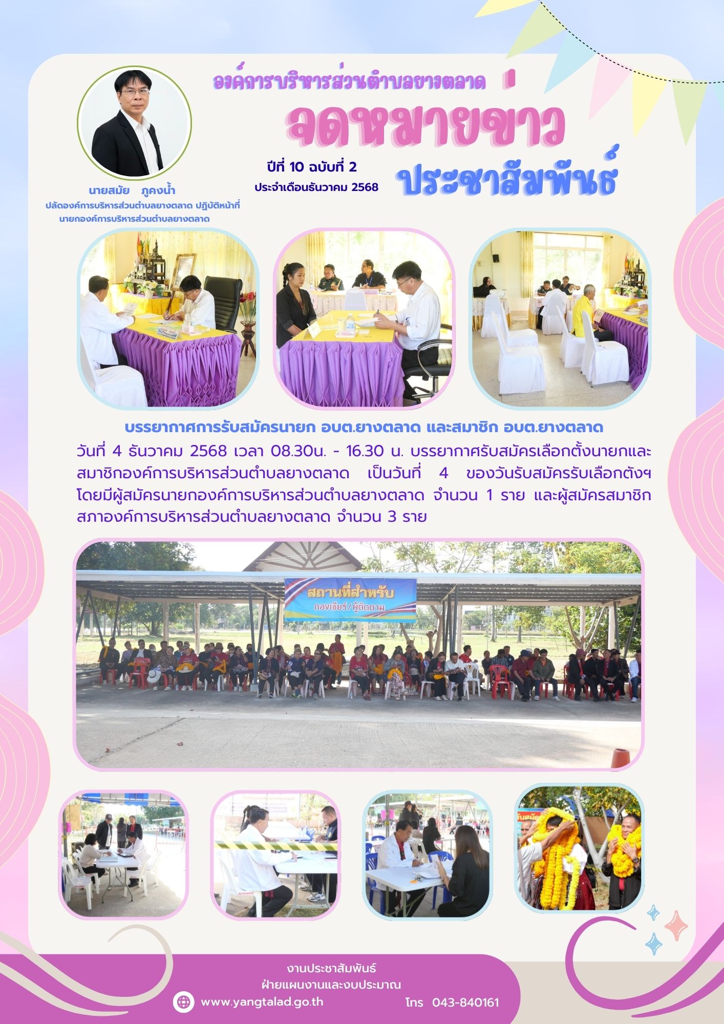 วันที่ 4 ธันวาคม 2568 เวลา 08.30น. - 16.30 น. บรรยากาศรับสมัครเลือกตั้งนายกและสมาชิกองค์การบริหารส่วนตำบลยางตลาด เป็นวันที่ 4 ของวันรับสมัครรับเลือกตังฯ โดยมีผู้สมัครนายกองค์การบริหารส่วนตำบลยางตลาด จำนวน 1 ราย และผู้สมัครสมาชิกสภาองค์การบริหารส่วนตำบลยางตลาด จำนวน 3 ราย