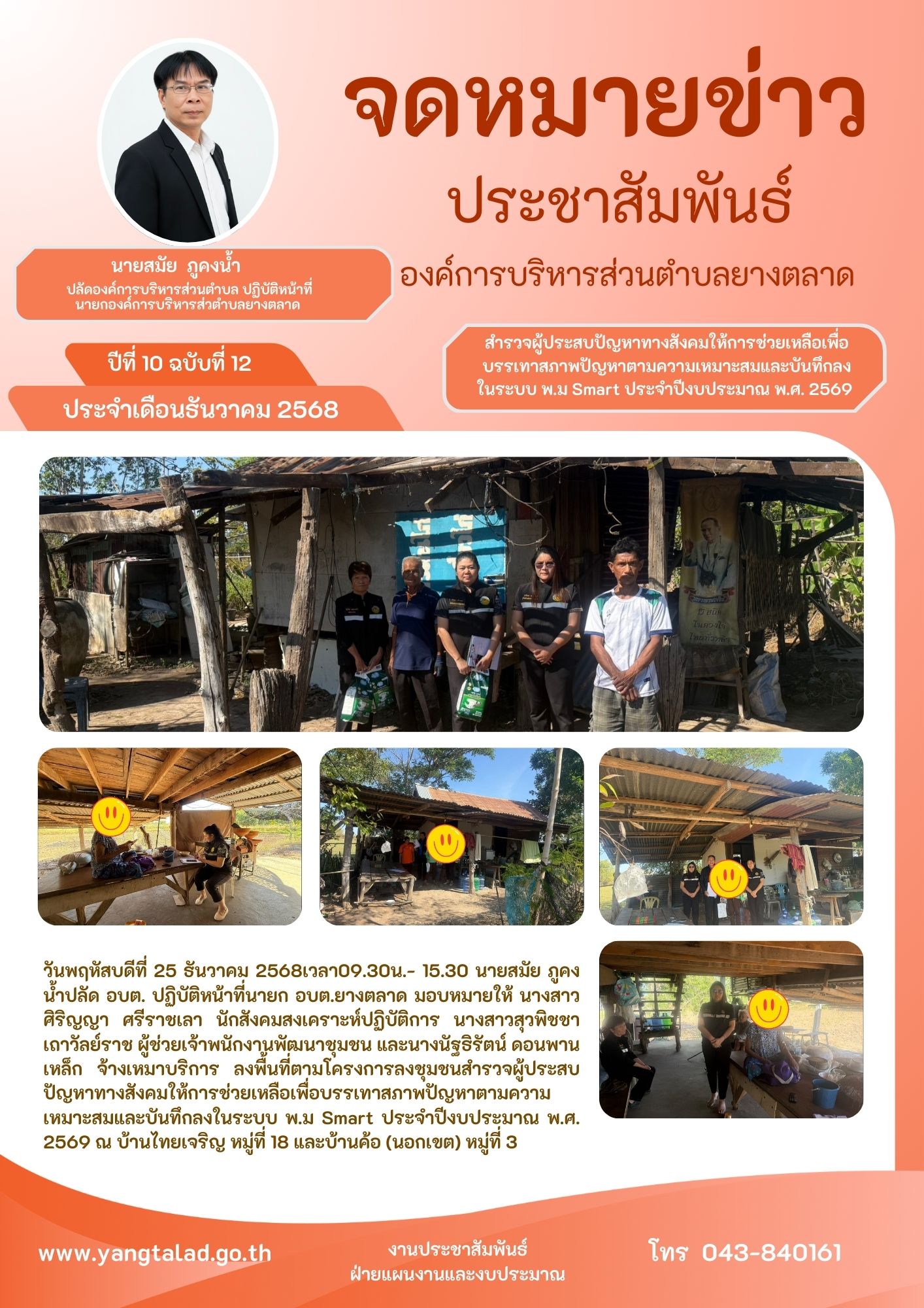 วันพฤหัสบดีที่ 25 ธันวาคม 2568 เวลา09.30น.- 15.30 นายสมัย ภูคงน้ำ ปลัด อบต. ปฏิบัติหน้าที่นายก อบต.ยางตลาด มอบหมายให้ นางสาวศิริญญา ศรีราชเลา นักสังคมสงเคราะห์ปฏิบัติการ นางสาวสุวพิชชา เถาวัลย์ราช ผู้ช่วยเจ้าพนักงานพัฒนาชุมชน และนางนัฐธิรัตน์ ดอนพานเหล็ก จ้างเหมาบริการ ลงพื้นที่ตามโครงการลงชุมชนสำรวจผู้ประสบปัญหาทางสังคมให้การช่วยเหลือเพื่อบรรเทาสภาพปัญหาตามความเหมาะสมและบันทึกลงในระบบ พ.ม Smart ประจำปีงบประมาณ พ.ศ. 2569 ณ บ้านไทยเจริญ หมู่ที่ 18 และบ้านค้อ (นอกเขต) หมู่ที่ 3