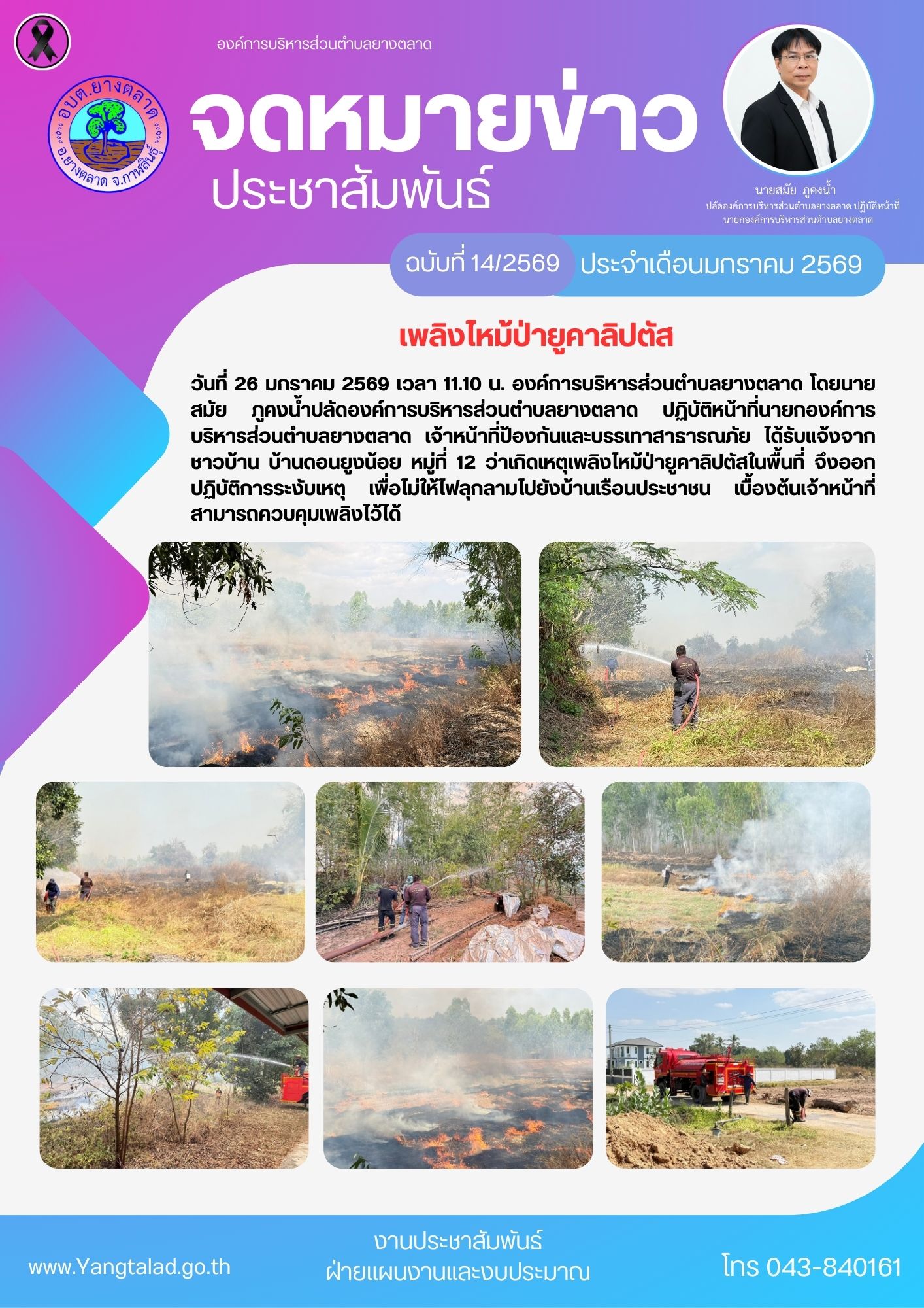 วันที่ 26 มกราคม 2569 เวลา 11.10 น. องค์การบริหารส่วนตำบลยางตลาด โดยนายสมัย ภูคงน้ำ ปลัดองค์การบริหารส่วนตำบลยางตลาด ปฏิบัติหน้าที่นายกองค์การบริหารส่วนตำบลยางตลาด เจ้าหน้าที่ป้องกันและบรรเทาสาธารณภัย ได้รับแจ้งจากชาวบ้าน บ้านดอนยูงน้อย หมู่ที่ 12 ว่าเกิดเหตุเพลิงไหม้ป่ายูคาลิปตัสในพื้นที่ จึงออกปฏิบัติการระงับเหตุ เพื่อไม่ให้ไฟลุกลามไปยังบ้านเรือนประชาชน เบื้องต้นเจ้าหน้าที่สามารถควบคุมเพลิงไว้ได้