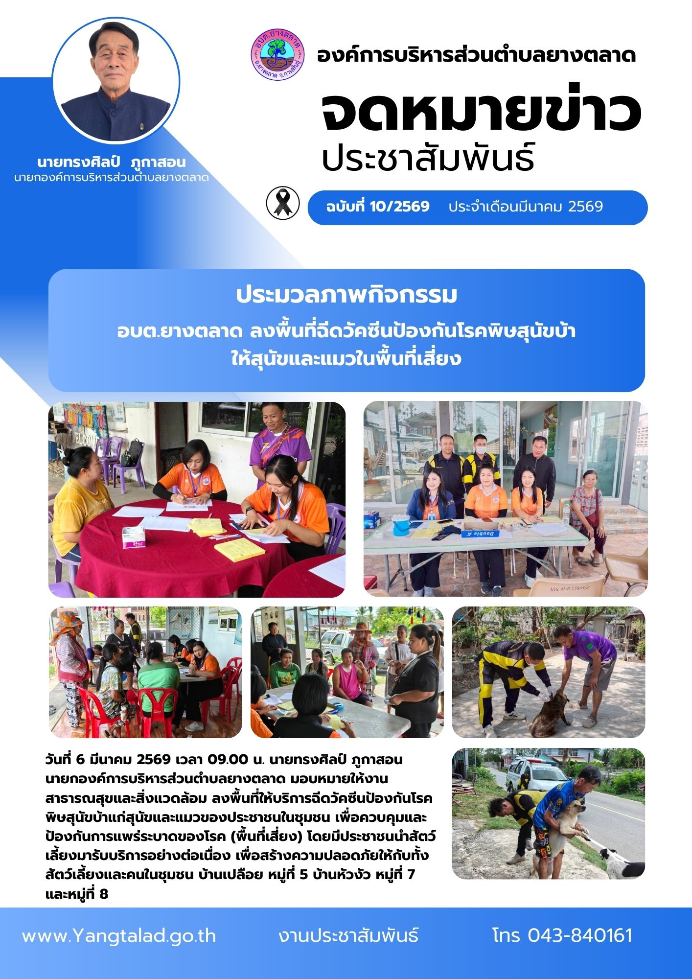 วันที่ 6 มีนาคม 2569 เวลา 09.00 น. นายทรงศิลป์ ภูกาสอน นายกองค์การบริหารส่วนตำบลยางตลาด มอบหมายให้งานสาธารณสุขและสิ่งแวดล้อม ลงพื้นที่ให้บริการฉีดวัคซีนป้องกันโรคพิษสุนัขบ้าแก่สุนัขและแมวของประชาชนในชุมชน เพื่อควบคุมและป้องกันการแพร่ระบาดของโรค (พื้นที่เสี่ยง) โดยมีประชาชนนำสัตว์เลี้ยงมารับบริการอย่างต่อเนื่อง เพื่อสร้างความปลอดภัยให้กับทั้งสัตว์เลี้ยงและคนในชุมชน บ้านเปลือย หมู่ที่ 5 บ้านหัวงัว หมู่ที่ 7 และหมู่ที่ 8