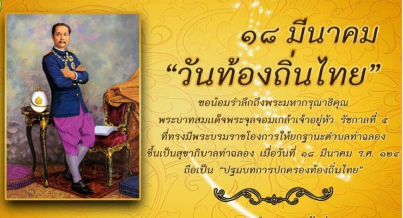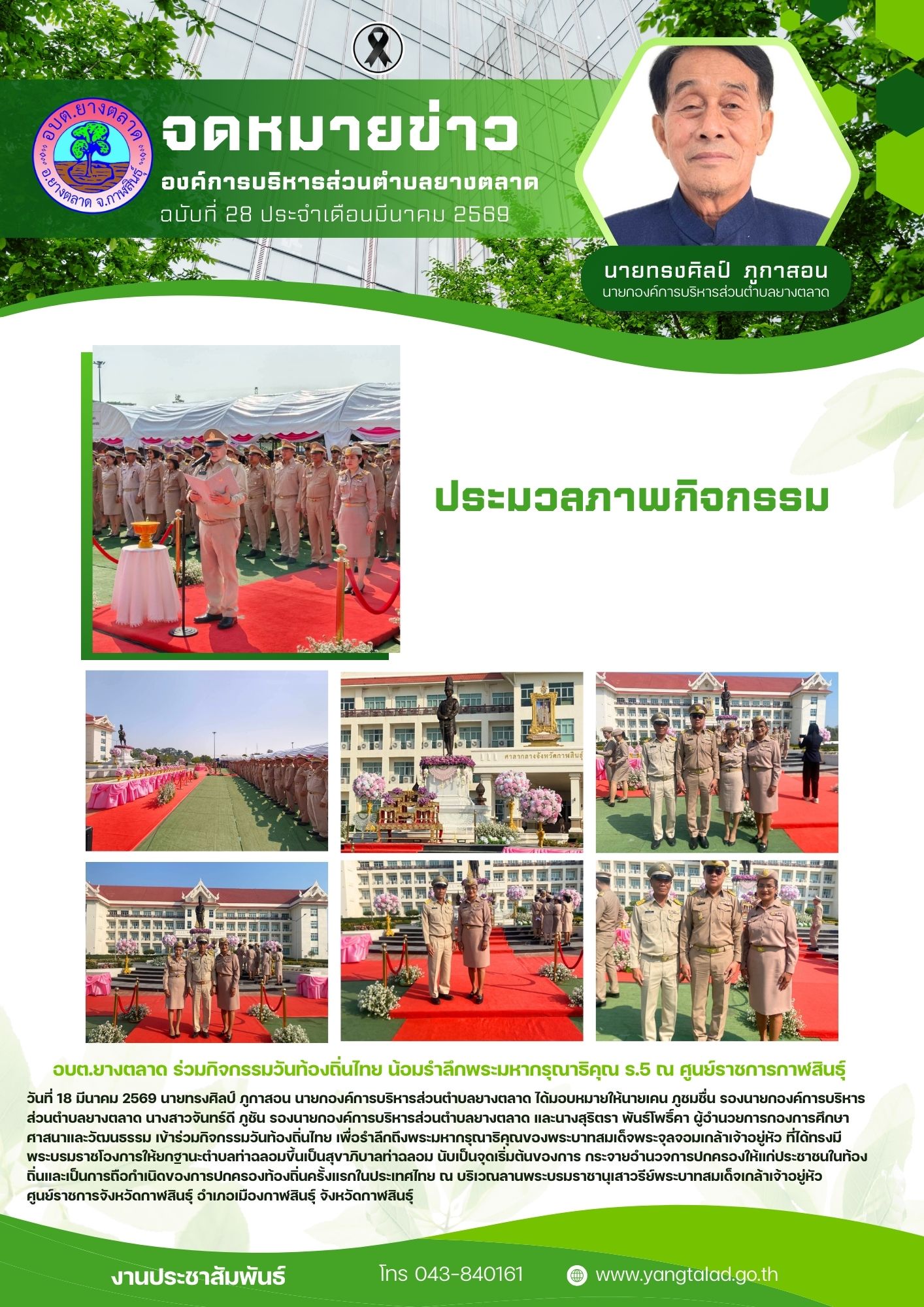 วันที่ 18 มีนาคม 2569 นายทรงศิลป์ ภูกาสอน นายกองค์การบริหารส่วนตำบลยางตลาด ได้มอบหมายให้นายเคน ภูชมชื่น รองนายกองค์การบริหารส่วนตำบลยางตลาด นางสาวจันทร์ดี ภูชัน รองนายกองค์การบริหารส่วนตำบลยางตลาด และนางสุริตรา พันธ์โพธิ์คา ผู้อำนวยการกองการศึกษา ศาสนาและวัฒนธรรม เข้าร่วมกิจกรรมวันท้องถิ่นไทย เพื่อรำลึกถึงพระมหากรุณาธิคุณของพระบาทสมเด็จพระจุลจอมเกล้าเจ้าอยู่หัว ที่ได้ทรงมีพระบรมราชโองการให้ยกฐานะตำบลท่าฉลอมขึ้นเป็นสุขาภิบาลท่าฉลอม นับเป็นจุดเริ่มต้นของการกระจายอำนวจการปกครองให้แก่ประชาชนในท้องถิ่นและเป็นการถือกำเนิดของการปกครองท้องถิ่นครั้งแรกในประเทศไทย ณ บริเวณลานพระบรมราชานุเสาวรีย์พระบาทสมเด็จเกล้าเจ้าอยู่หัว ศูนย์ราชการจังหวัดกาฬสินธุ์ อำเภอเมืองกาฬสินธุ์ จังหวัดกาฬสินธุ์