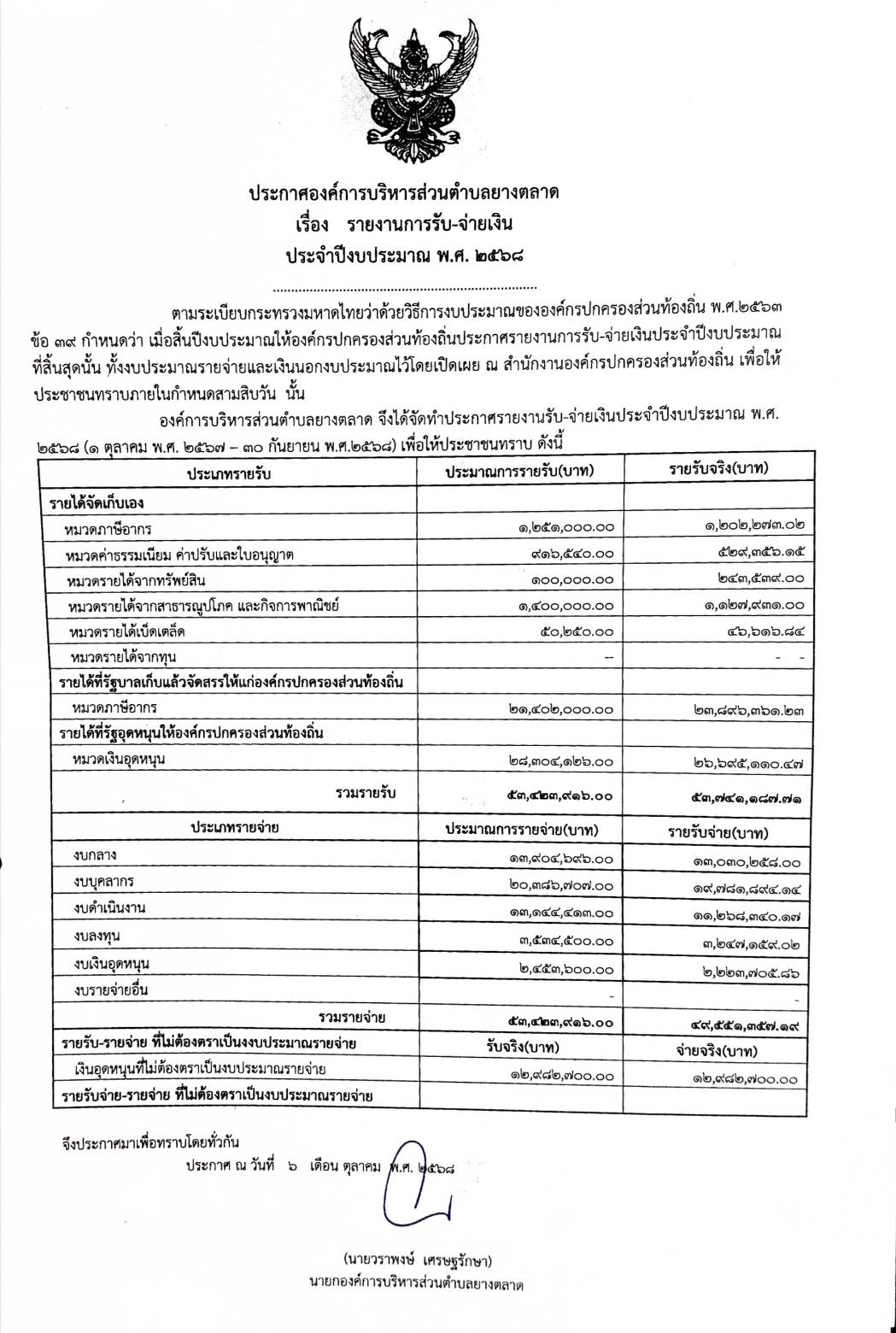 ประกาศองค์การบริหารส่วนตำบลยางตลาด เรื่อง รายงานการรับ-จ่ายเงิน ประจำปีงบประมาณ พ.ศ.2566 |